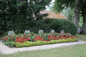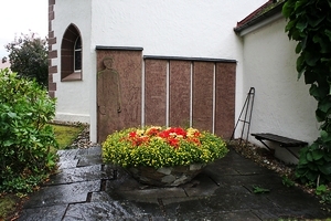 Aussen an der Kirche; Gedenktafeln, linke Tafel mit Bildrelief (2. Weltkrieg); im Friedhof Soldatengräber; zusätzlich Hinweis zu Soldaten von privaten Gedenksteinen