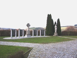Vor der katholischen Kirche St. Michael im Ortsteil Weißenbronn stehen zu beiden Seiten eines Steinkreuzes jeweils zwei Tafeln mit Namen und Daten der Opfer beider Weltkriege.