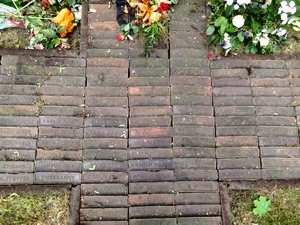 eingefassten Kreuz angeordnete Ziegel zeigen jeweils einen Namen der Kriegsopfer. Diese Steine und die