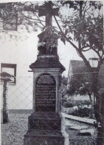 Säule auf zweifach getrepptem Sockel, eingelassene Platte mit Inschrift, darüber christliche