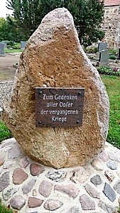 Gedenkstein für alle Kriegsopfer auf dem Friedhof; Gedenktafeln in der Kirche. Gedenken auf