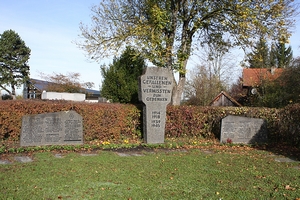 Im Friedhof; Steinkreuz mit Inschrift, flankiert von zwei Steintafeln