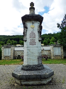 erweitert 1961. In der Mitte auf einem Sockel erhebt sich eine rechteckige Säule aus Juramarmor mit