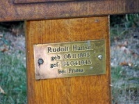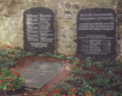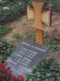 Holzkreuz mit vorliegender Steintafel, auf dieser zwei kleine Messingtafeln mit der Inschrift „Zum Gedenken“ und Namen sowie Daten