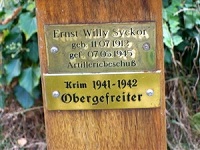 Holzkreuz mit kleiner Namenstafel Auf einem zusätzlich angebrachten Schild steht Krim1941-1942 und der Dienstgrad