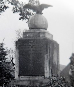 Quadratisches Steindenkmal auf Feldsteinsockel, oben mit Kugel und Adler mit ausgebreiteten Schwingen. Gedenken auf der Empore der Kirche Henningen. Ehrenliste für die Gefallenen des 1. Weltkriegs