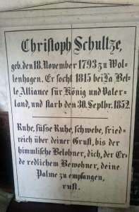 Tafel 1815: Christoph Schultze geb. den 18.November1793 zu Wollenhagen. Er focht 1815 bei La Belle Alliance für König und Vaterland, und starb den 30.Septbr.1852. Ruhe, süsse Ruhe, schwebe, friedreich über deiner Gruft, bis der himmlische Belohner, dich, der Erde redlichem Bewohner, deine Palme zu empfangen ruft.