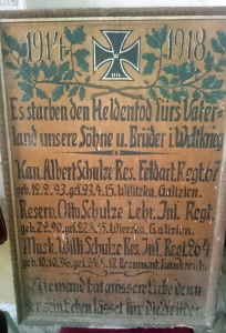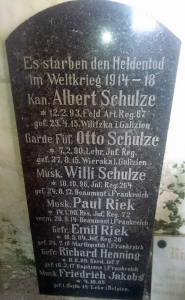 Tafel Gebrüder Schulze: 1914 1918 Es starben den Heldentod fürs Vaterland unsere Söhne u. Brüder i. Weltkrieg (3 Namen) Niemand hat größere Liebe, denn der sein Leben lässet für die Brüder