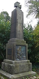 Denkmalsäule mit Eisernen Kreuz und Relief eines knienden Soldaten. An den Seiten befinden sich zwei Namenstafeln mit den Angaben zu den Kriegstoten des Ersten Weltkrieges; Ehrenliste für die Gefallenen des 1. Weltkriegs; Gedenken auf Familiengräbern