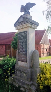 Denkmal für die Gefallenen des 1. Weltkriegs auf dem Dorfplatz: Stele mit tempelartigem Aufsatz, gekrönt von einem Adler und Stahlhelm-Relief und seitlichen Granaten-Plastiken; Soldatengrab und Gedenkstein auf dem Friedhof