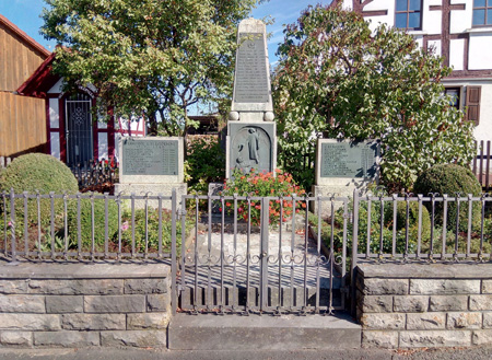 Dreiteiliges Denkmal innerhalb einer kleinen, sehr gepflegten Anlage für beide Weltkriege. Es sind auch die Kriegsteilnehmer am 1. Weltkrieg verzeichnet.