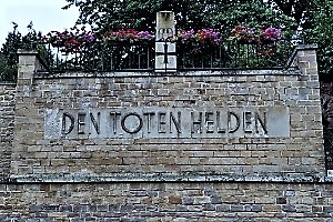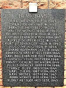 Plateau mit Mauer und Stele für den 1. Weltkrieg, Wandplaketten für 1. und 2. Weltkrieg