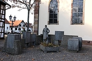 Bei der Kirche: Soldat mit Gewehr, rundherum mehrere Steinblöcke mit Namen; zusätzlich Hinweise zu Soldaten von privaten Gedenksteinen