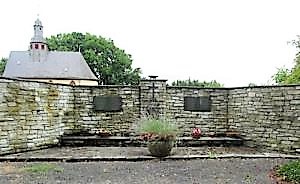 U-Förmige Einbuchtung in der Friedhofsmauer, in deren Mitte eine Feuerschale, Darunter ein Kreuz und eine Inschrift, sowie eine Gedenkplatte. An der Mauer links und rechts davon, zwei weitere Gedenkplatten.
