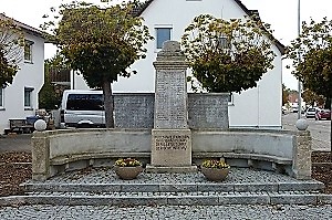 Halbrundes Denkmal mit Vorplatz am Kreisverkehr Ortsmitte Ay, schräg gegenüber der Kapelle