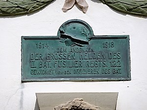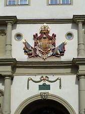Bad Mergentheim (Deutschordensschloss), Main-Tauber-Kreis, Baden-WürttembergPLZ 97980 Metalltafel mit Stahlhelm, Eichenlaubzweigen und Inschrift über dem Äußeren Tor des Deutschordensschlosses