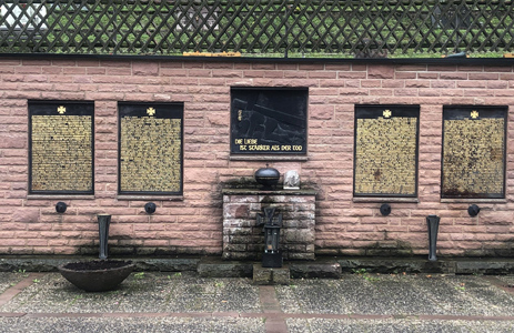 Die Gedenktafeln an der Friedhofsmauer vor der Aussegnungshalle