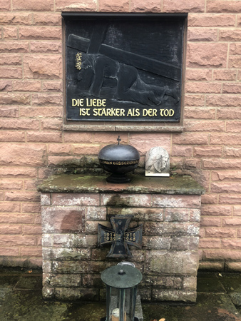 Mittig eine Metalltafel mit Inschrift und dem Relief des kreuztragenden Christus mit Dornenkrone,