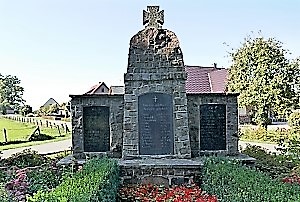 Gemauertes Denkmal mit drei eingelassenen Namenstafeln.