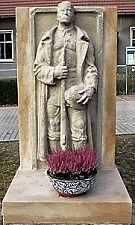 Burg (Spreewald). Ein Soldat hält in der rechten Hand ein Gewehr, in der linken Hand