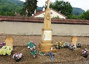 Châtel-Saint-Germain (Deutsche Kriegsgräberstätte 1870/71), Département Moselle, FrankreichPLZ 57160 Kriegsgräberstätte für 52 unbekannte deutsche Soldaten. Obelisk mit krönendem Kreuz und Inschrift und beidseitig stehenden unbeschrifteten Grabkreuzen.