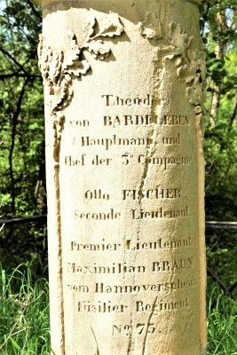 Hier ruhen (Namen Offiziere) Sämtlich vom Hannoverschen Füsilier Regiment No. 73 Sie starben den Heldentod mit Gott für König und Vaterland am 14. August 1870 im Gefecht von Metz. Ihrem Gedächtnis und den in demselben Gefecht gebliebenen 15 Unterofficieren und 136 Füsilieren desselben Regiments weiht dieses Denkmal das Officier-Corps.