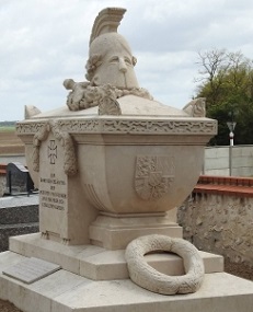 Grabdenkmal auf Deutscher Kriegsgräberstätte des Krieges 1870/71 (ohne Namen). Sarkophag mit krönendem antiken Helm.