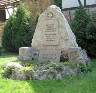 Auf dem Kirch-Friedhof steht ein Naturstein mit Gedenktafel für beide Weltkriege ohne Namen. In der verschlossenen Kirche sind die Gefallenen und Vermissten namentlich verzeichnet. Weitere Angaben von Einzelgedenken auf Privatgräbern.