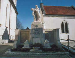Denkmal, südwestlich der Pfarrkirche St. Johann Baptist, auf dem Friedhof. Das Denkmal ist beschädigt (Inschrift fällt ab), deshalb ist der mittlere Teil in einer Plastikfolie verpackt. Zusätzlich Hinweise zu Soldaten von privaten Gedenksteinen