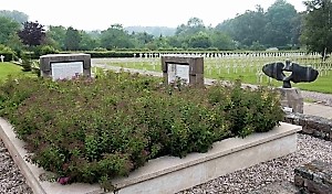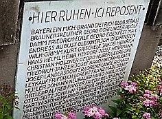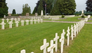 Französische Kriegsgräberstätte neben dem städtischen Friedhof. Ein Block mit deutschen Einzelgräbern wurde umgebettet. Deutsche Soldaten ruhen noch zusammen mit Franzosen in den Massengräbern. Steintafeln listen die Namen auf.