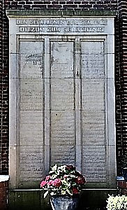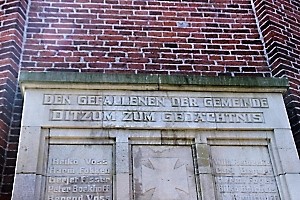 Vor dem Kirchturm befindet sich eine hohe dreispaltige Steintafel mit dem Namen der Gefallenen und Vermissten. Unter dem Spruch in der zweiten Spaltebefindet sich ein Eisernes Kreuz.