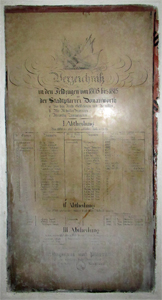 Auf allerhöchsten Befehl aufgestellt am 18.Juli1833 Magistrat und Pfarramt der kgl. bay. Stadt Donauwörth Franz Böhm Bgm. Karl Prugger Stadtpfarrer L. Kremer Stadtschreiber