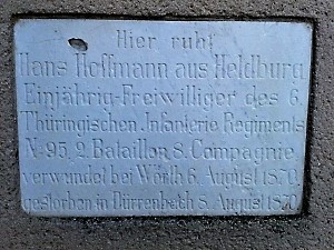 1870/71: Hier ruht Hans Hoffmann aus Heldburg. Einjährig-Freiwilliger des 6. Thüringischen Infanterie Regiments No. 95. 2. Bataillon 8. Compagnie verwundet bei Wörth, 6. August 1870, gestorben in Dürrenbach 8. August 1870