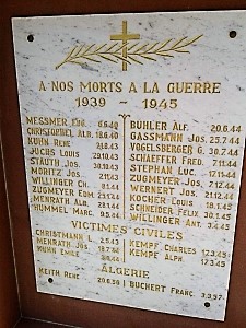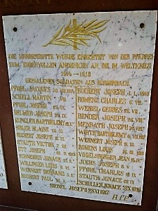 Die Gedenktafeln befinden sich an der Kirchenaußenmauer rechts und links vom Eingang. Früher befand sich der Kirchhof sicher neben der Kirche, wo wohl auch der 1870 Gefallene bestattet wurde. Heute ist die Fläche gepflastert. Die im 1. Weltkrieg gefallenen Einwohner mussten sicher auf deutscher Seite kämpfen. Unter den Opfern des 2. Weltkriegs können sich auch auf französischer Seite Gefallene befinden. Auf der Gedenktafel sind auch zwei in Algerien 1957/58 Gefallene angegeben, die hier nicht mit aufgelistet werden. Weitere Informationen beim Volksbund Deutsche Kriegsgräberfürsorge: www.volksbund.de/graebersuche