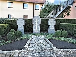 Das Denkmal für beide Weltkriege neben der Kirche besteht aus drei Steinen in Kreuzform. Die Gefallenen des 1. Weltkrieges sind zusätzlich auf einer kunstvoll geschnitzten Holztafel im Eingangsbereich der Aussegnungshalle verzeichnet.