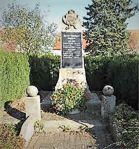 Denkmalstele mit schwarzer Inschriftentafel in einer kleinen Anlage.