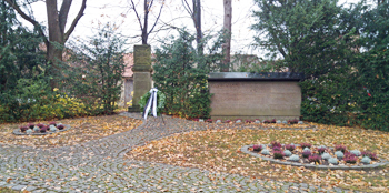 In einem kleinen Park an der Durchgangsstraße: Stele für den 1. Weltkrieg, daneben eine Sandsteinmauer für den 2. Weltkrieg.
