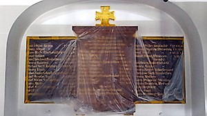 Gedenktafel in der katholischen Kirche St. Stephanus (wegen Bauarbeiten mit Folie geschützt). Hier ist nur ein Teil der Opfer aus Edersfeld und den umliegenden Orten verzeichnet.