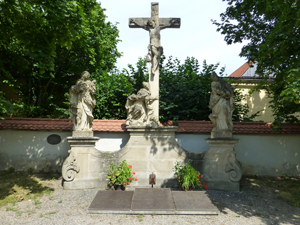 Drei Gedenktafeln für die Gefallenen und Vermissten beider Weltkriege liegen vor einer Kreuzigungsgruppe auf dem Friedhof.