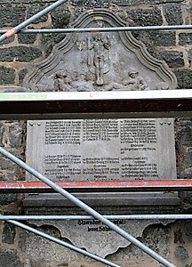 Die Gedenktafel an der Außenwand der Kirche wird gerade aufwendig restauriert. Die noch fehlenden Namen konnten von einem Foto im Eingangsbereich abgeschrieben werden.