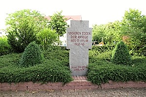 Ein kreuzförmiger Gedenkstein auf dem angrenzenden Friedhof erinnert an die letzten drei Kriege.