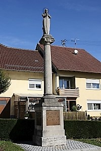 Bei der Kirche; auf einem quadratischen Sockel runde Säule, oben mit Steinplastik "Ritter mit Schild", am Sockel Tafeln; zusätzlich Hinweise zu Soldaten von privaten Gedenksteinen