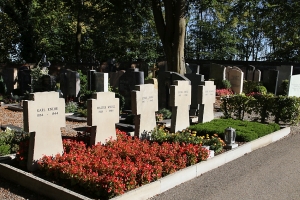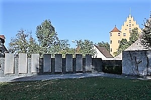Bei der Kirche; an einer Mauer acht Steinplatten und daneben eine grössere Platte mit Bildrelief; im Friedhof eine Reihe Kriegsgräber und zusätzlich Hinweise zu Soldaten von privaten Gedenksteinen