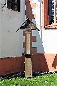 Denkmal bei der Kirche; überdachtes Holzkreuz mit Tafel