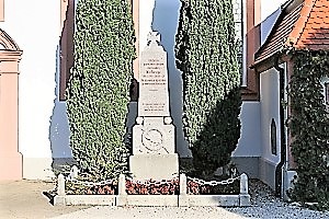Bei der Kirche; Säule oben mit Eisernem Kreuz, vorne Inschriften, seitlich Namen