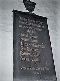 Tafel 1813-15: Fischbeck 1816. Namen derer die als Opfer für das Vaterland in den Jahren 1813-1815 gebliebenen Fischbecker (Namen) Siehe wir Preisen Selig die Erduldet haben.