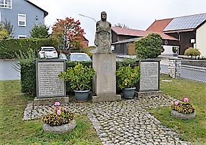 Die Statue einer trauernden Frau kniet auf dem Sockel, der die Inschrift trägt. Zu beiden Seiten stehen Steintafeln mit den Namen und Todesjahr der Gefallenen.