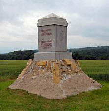 Auf dem Schlachtfeld errichtetes schlichtes Denkmal, gefügt aus Natursteinplatten über einem aus Steinbrocken errichteten Sockel. Mit Inschriften, ohne Namen (früher von einem mächtigen Adler mit Schwert gekrönt)