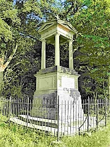 Denkmal für die Gefallenen des Infanterie Regiments Nr. 84. Sockel mit aufgesetzten Tempel und krönendem Kreuz (früher mit Altar und EK unter dem Tempeldach in dem die Namen der Offiziere eingraviert waren). Ein Teil einer der zwei seitlichen Namenstafeln der Unteroffiziere und Mannschaften fehlt.