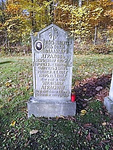 Stehender Sandsteingrabstein auf Sockel mit Spitzgiebel. Darin eine Sonne und ein Foto. Kyrillischer Text oben, darunter: Hier ruht in Gott -Name- Du bleibst deinen Eltern u. Schwester unvergeßlich. Die Gräber beider Atrachows stehen dicht beisammen.
